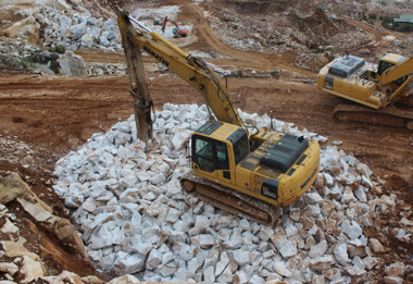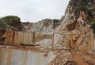 圖3結(jié)構(gòu)完整的大理石礦,被工人在山上就地切成塊狀,運(yùn)到山下通過(guò)圓盤鋸的切割,制成天然大理石板材。