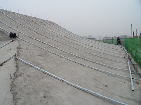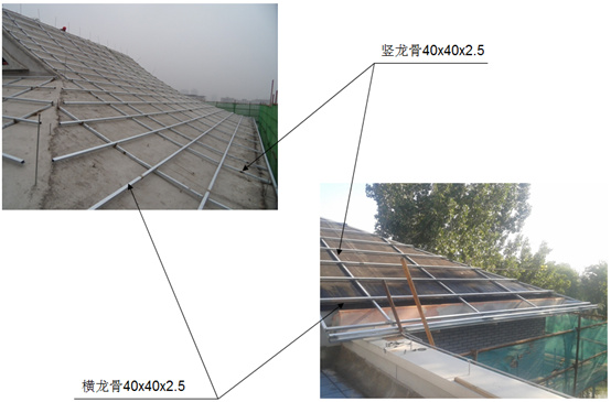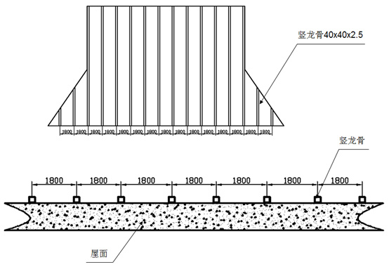 1、鋪設豎龍骨:根據(jù)屋面檐口尺寸,分中間距1800布置豎龍骨;