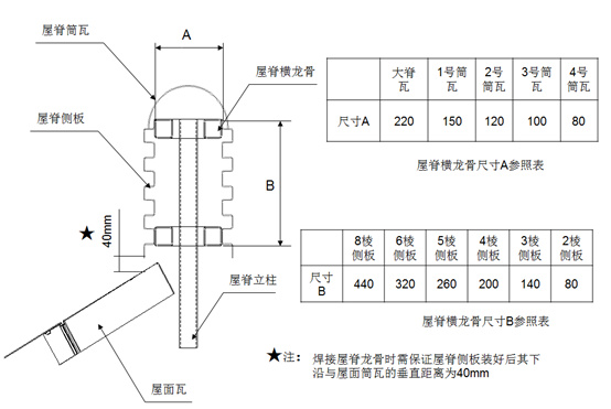 注:側板與屋脊龍骨使用5X20鉚釘鉚接;