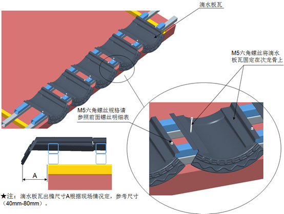 注:如圖所示斜當勾與屋面瓦交接部位需打膠。