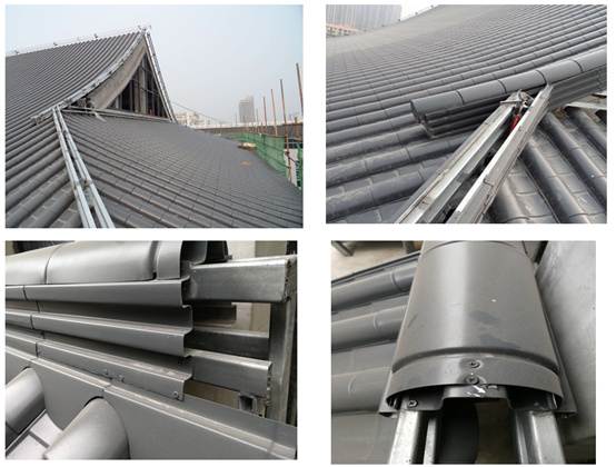 6、安裝瓦當筒瓦、金屬仿古連體瓦:安裝兩塊瓦當筒瓦后接著安裝一塊連體瓦,一次交替安裝:
