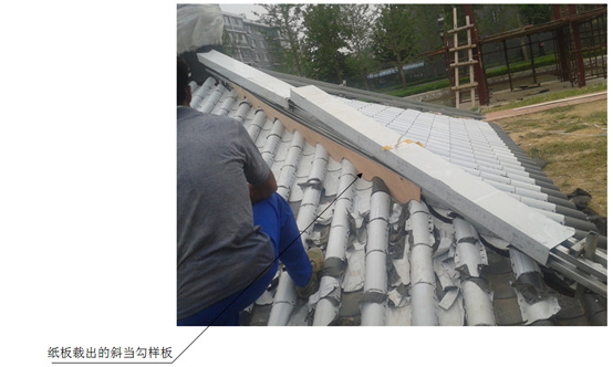 1、根據(jù)現(xiàn)場的安裝情況如圖所示先用紙板裁出斜當勾樣板,比對樣板與屋面瓦間隙控制在3mm以內;