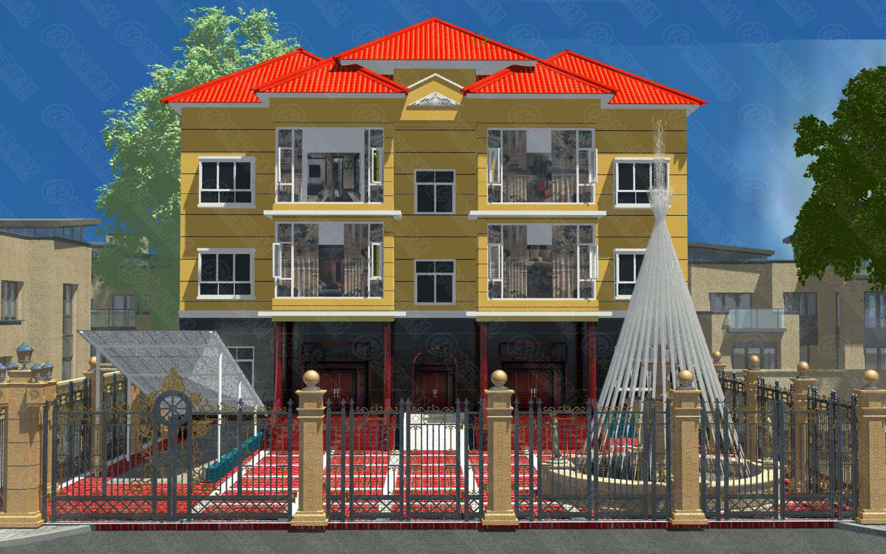 它也可以運用棗紅色屋面來鋪設(shè)的效果圖,看上去的話 挺適合搭配現(xiàn)代年輕人的生活方式
