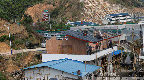面對擋土墻生硬,部分場地存在水土流失風(fēng)險的問題,蒲蘆瑤族鄉(xiāng)著力將擋土墻加固,就場地增加鵝卵石護(hù)坡。經(jīng)過一個月的改造,如今的六羊屯道路比以前更整潔了,房子更漂亮了,農(nóng)屋墻角線、墻裙線錯落有致,整齊劃一,遠(yuǎn)遠(yuǎn)望去,一排排整齊的瑤寨新屋,層次感鮮明。在村屯的一角,工人們在忙著搬運(yùn)坡屋頂方條,鐵架,焊接,刷板,油漆,一派繁忙景象。