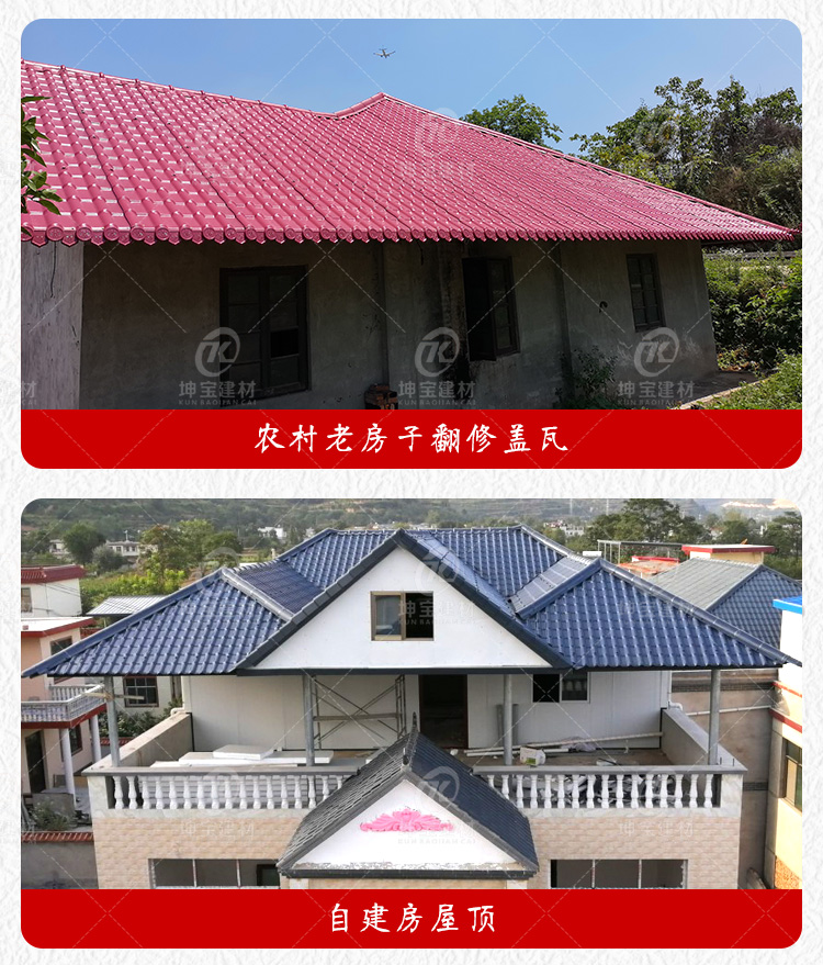 用途:平改坡屋面,別墅屋面,農(nóng)村自建房屋面,民宅屋面,工業(yè)廠房,仿古建筑,涼亭圍墻裝飾等