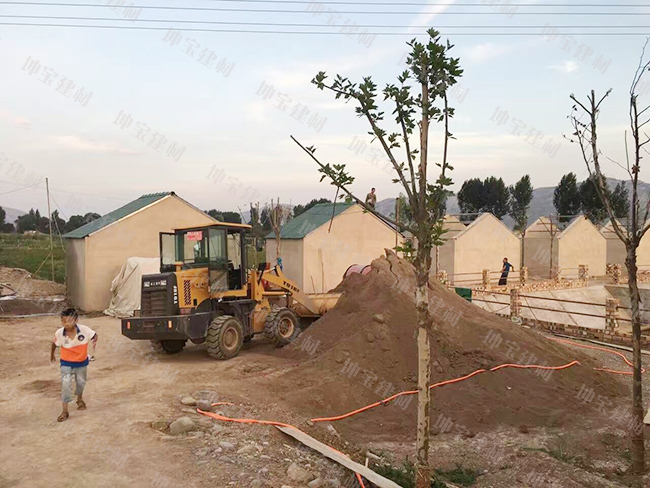 甘肅某綠色生態(tài)園農(nóng)莊第一期建設(shè)工程正式動土開工,從坤寶建材專門定制生產(chǎn)的草綠色合成樹脂瓦也安裝了兩間樣板房,工人們正冒著高溫酷暑在工地上施工。 甘肅某生態(tài)園施工現(xiàn)場 修建生態(tài)園房屋所用的墻磚 坤寶牌草綠色樹脂瓦根據(jù)每間房屋的需求量被堆放在旁邊