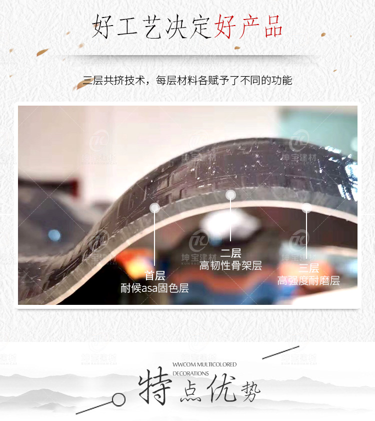4.色彩持久:選用高耐候工程樹脂共擠壓制而成,具有很好的耐候性。自然環(huán)境下可確保十年顏色變化